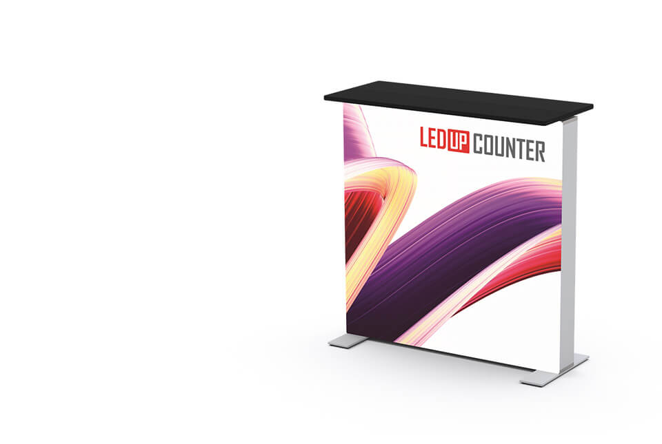 Multi frame LEDUP counter ist ein mobiles Thekensystem mit beidseitig hinterleuchteten Bildflächen. Die Theke besteht aus einem LED Rahmen 100×100 cm, zwei Füßen, welche mit Handschrauben am unteren Profil montiert werden, sowie einer faltbaren Thekenplatte, welche einfach auf die ausgedrehten Halterungen aufgelegt wird.